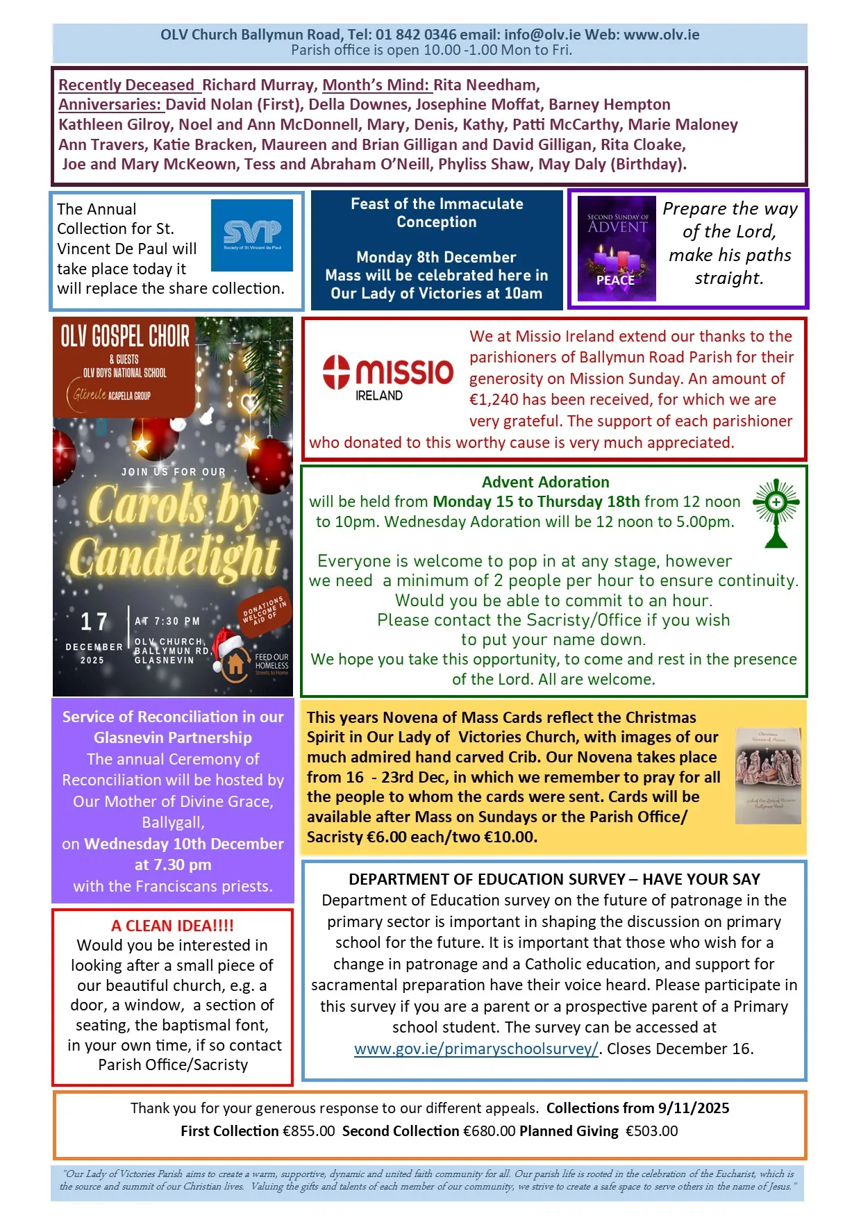 We are also taking the opportunity to update our parish database so if you have not already kindly supplied us with your phone/email contact details you may ring the number (01) 842 0346.